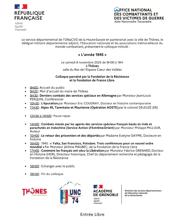 THONES – SAMEDI 8 NOVEMBRE -COLLOQUE « ANNÉE 1945 »