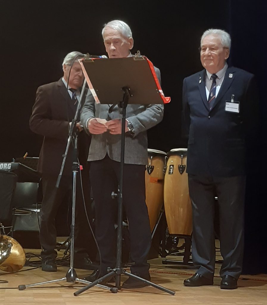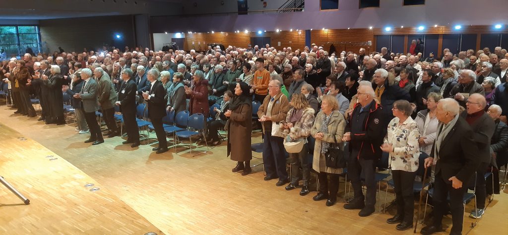 Le 24 janvier, l’union nationale des combattants 74 a organisé sa traditionnelle cérémonie annuelle des vœux à l’Espace Rencontre d’Annecy le Vieux. L’assemblée a été accueillie à domicile par Jacky Haudiquert, président de l’UNC Annecy-le-Vieux et président délégué de l’UNC 74. Puis Jean-Paul Ducimetière président départemental a adressé ses vœux aux autorités qu’il a remercié de leur présence : Loïc Hervé vice-président du Sénat, Lionel Tardy vice-président du conseil départemental de la Haute-Savoie et délégué aux anciens combattants. Il a ensuite remercié les 59 associations locales de combattants présentes, ce qui représentait plus de 600 participants de toutes générations. Il a enfin lancé un appel pour le recrutement des cadets de l’UNC, afin d’assurer la relève des anciens combattants, pour cela il a évoqué l’école des jeunes porte drapeau (EJP 74) soutenue par le conseil départemental. Michel Guédon vice-président de l’UNC 74 et responsable du comité d’entraide a pris la parole pour rappeler que le produit de cette journée bénéficierait aux œuvres de solidarité de l’association au profit des membres nécessiteux, puis il a introduit le concert de l’orchestre Veyrier Orchestra dirigé par Eric Moron, ancien chef de fanfare du 27e bataillon des chasseurs alpins. Celui-ci nous a livré un programme éclectique comme l’auditoire, du répertoire classique (ouverture par le célèbre « Ainsi parlait Zaratoustra ») à la variété (Nougaro, Becaud) en passant par le folklore (Etoile des neiges) et patriotique (les Allobroges au final): un spectacle de grande qualité. Le concert achevé sous les ovations, les invités ont partagé le verre de l’amitié. Cette journée a atteint les buts que s’était fixée l’UNC : agir pour ses adhérents.