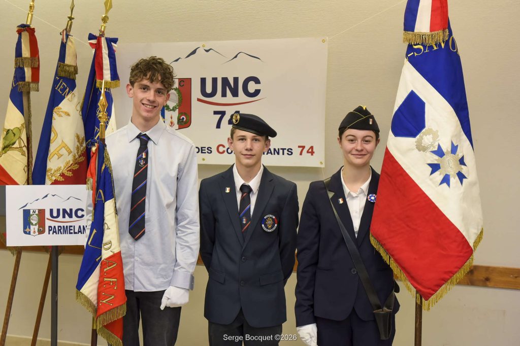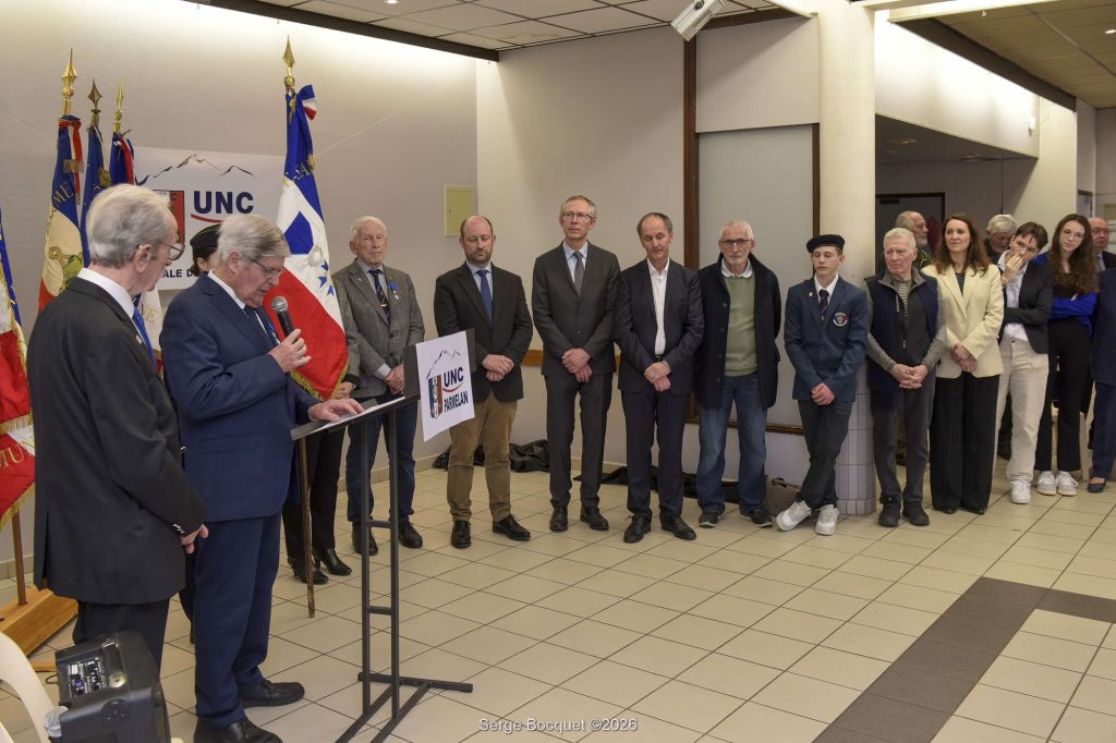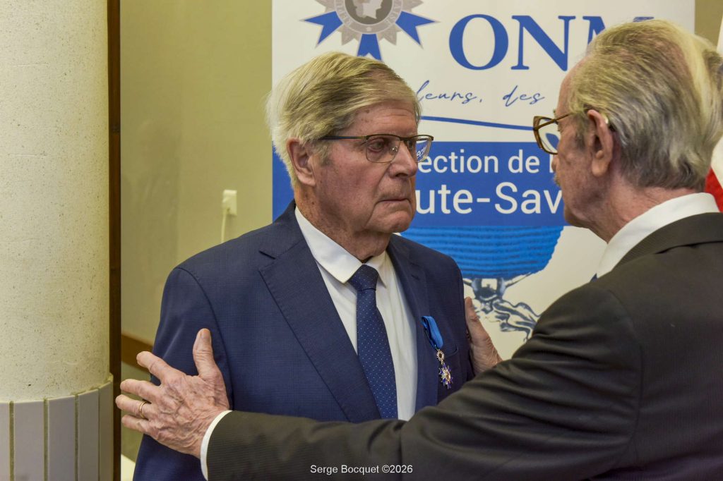 Notre ami Michel a reçu les insignes de chevalier de l’Ordre National du Mérite ce samedi 31 janvier 2026, au cours d’une cérémonie qui s’est tenue à Naves-Parmelan dans la Salle Polyvalente en présence de Loïc Hervé vice-président du Sénat, du directeur de l’ONaCVG Patrick Lecuppre et son adjoint Vincent Jullion, des maires de Villaz, Naves-parmelan, Fillière, du maire délégué des Ollières ainsi que des membres du bureau de l’UNC 74 Jean-Paul Ducimetière, Jacky Haudiquert, Frédéric Habauzit, du cadet de l’UNC Aron Dunand, des membres de sa famille et de nombreux invités. La cérémonie s’est déroulée dans la dignité, Hubert Bornens officier de l’ONM, président honoraire de l’UNC 74 « parrain » choisi par Michel a d’abord accueilli les participants, il a ensuite donné la parole à Annie Coutin vice-présidente de l’ANMOM 74, elle a excusé le président Raymond Mudry retenu par un autre engagement, elle a rappelé que c’est par décret du 2 décembre 2025 que Michel Guedon a été élevé au grade de chevalier de l’ONM et elle a ensuite évoqué les valeurs de l’ONM « L’ordre national du Mérite récompense des mérites distingués acquis soit dans une fonction publique, civile ou militaire, soit dans l’exercice d’une activité privée« . Hubert Bornens a fait l’éloge du récipiendaire engagé depuis 62 ans dans la vie associative civile et patriotique, son passé militaire de sergent de 27 mois en tant qu’appelé en Afrique du Nord a été évoqué, il est depuis 1999 président de l’UNC Parmelan, membre de la commission solidarité du CDAC (ONaCVG, vice-président de l’UNC 74, président du comité solidarité de l’UNC 74, il a également assuré la fonction de secrétaire général. Puis le moment est venu pour Hubert Bornens de lui remettre dans la dignité les insignes de l’Ordre National du Mérite. Loïc Hervé a félicité le récipiendaire en rappelant que cette distinction est remise à ceux qui s’engage bénévolement pour servir les valeurs de la république. Michel a ensuite avec émotion remercié les personnes qui ont œuvré pour que cette distinction lui soit remise. Un cadeau de l’UNC 74 lui a été remis par Jean-Paul Ducimetière et un bouquet de fleur a été offert à sa compagne Mireille par Jacky Haudiquert.
