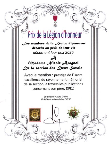 Le livre de Michel Germain et Nicole Aragnol préfacé par le Général Jean-René Bachelet a été labellisé « 80 ans LIBERATION » en 2025 avec la participation de l’ONaCVG 74. L’UNC 74 et l’UDAACM ont co-financé une première édition de 200 exemplaires. Nous sommes aujourd’hui très heureux de présenter à Nicole Aragnol vos très vives félicitations pour ce prix. Ce livre retrace le glorieux passé de son père Georges Aragnol 1920-2000 « Une vie au service de son pays – Chasseur Alpin Sergent du 27e B.C.A. – résistant de l’Armée Secrète de Haute-Savoie – Les Glières – Déporté à Dachau et à Leitmeritz « .