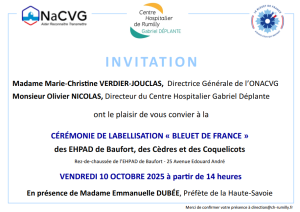 « Tous les Évènements Cet évènement est passé. cérémonie de Labellisation « Bleuet de France » des EHPAD de Baufort, des Cèdres et des Coquelicot 10 octobre à 14 h 00 min - 16 h 00 min « Hommage à Georges DUFFAUD VISITE DG ONACVG – rencontre avec le monde combattant » Ajouter au calendrier Google Agenda iCalendar Outlook 365 Outlook Live Détails Date : 10 octobre Heure : 14 h 00 min - 16 h 00 min